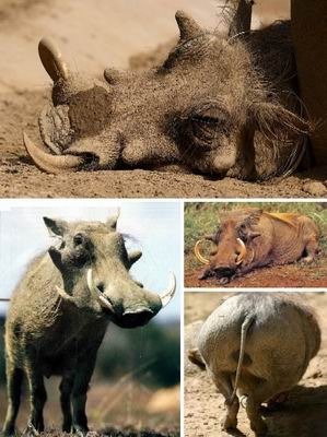 疣豬是野生豬家族成員之一,它長得像家豬、蟾蜍,還有些像犀牛,這種動物的學名是“Phacochoerus africanus”。疣豬是一種不具攻擊性的動物,通常漫游在非洲稀樹草原上尋找一些綠色植物根莖為食。長在面部的突起實際上是骨突,雄性的骨突更大,用於跟競爭者進行爭斗。它還長有一對獠牙,實際上這僅是生長較突出的犬齒,有時看上去像鋒利的軍刀。