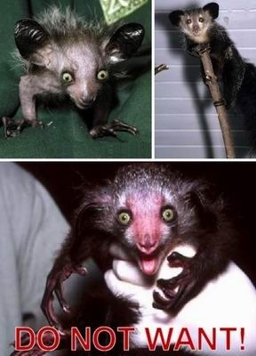 狐猴的學名為 “Daubentonia madagascariensis”,生活在馬達加斯加島,這種靈長目動物毛發稀少,看上去非常像一位古稀老人,狐猴的進食方式十分特殊,它們將手指伸入樹洞中尋找樹蛆。馬達加斯加島上的居民對於狐猴十分忌諱,通常遇到它們時會認為這是厄運的前兆。