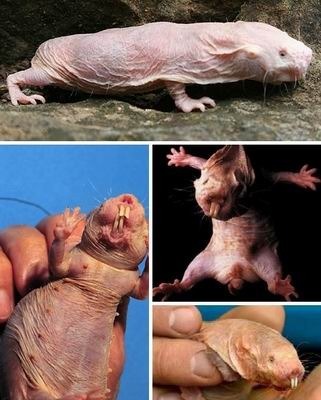 裸體鼴鼠的學名為 “Heterocephalus glaber”,它們不僅長相非常怪異,並且行為方式也十分特殊。它們的生活方式更接近於螞蟻和蜜蜂,而不像哺乳動物。它們的身體幾乎沒有毛發,視力很差,缺乏疼痛感。目前,科學家認為裸體鼴鼠不會患有癌症,健康專家對這種動物也非常感興趣。